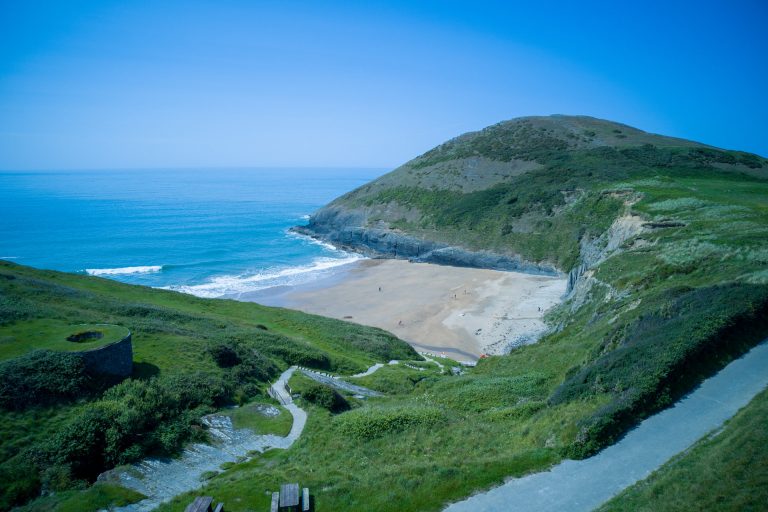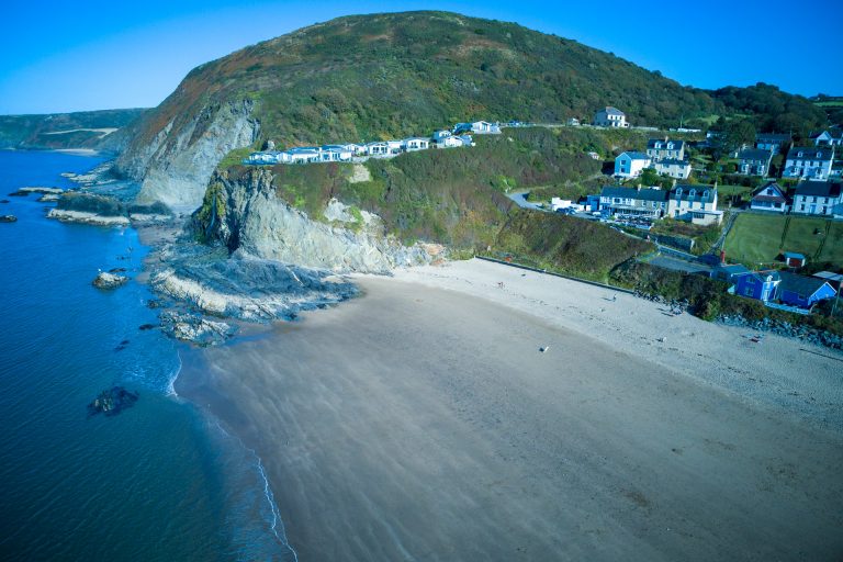 This beach has a small entrance so parking is just before the village with a five-minute walk downhill. Lifeguard on duty. When the tide goes out it reveals a second beach with a waterfall where the Saith river tumbles over the cliff – perfect for a fresh water shower. When the tide is fully in it’s a great place for a spot of mini-coasteering, leaping from the fantastic rocks just offshore, a level suitable for all ages to jump from, even the cautious! Lovely ice-cream shop close by. The Ship Inn overlooking the beach do really good food with a great view.